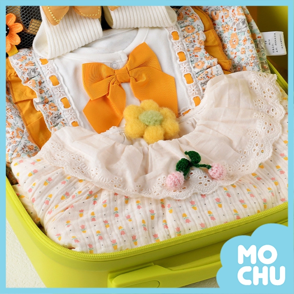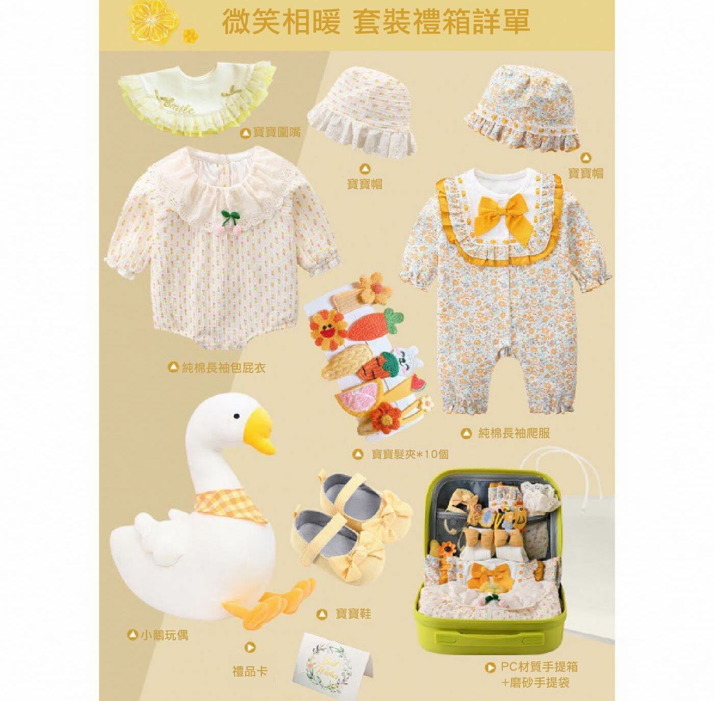 寶寶圍嘴、寶寶帽、純棉長袖包屁衣、寶寶髮夾*10個、純棉長袖爬服、小鵝玩偶、禮品卡、寶寶鞋、