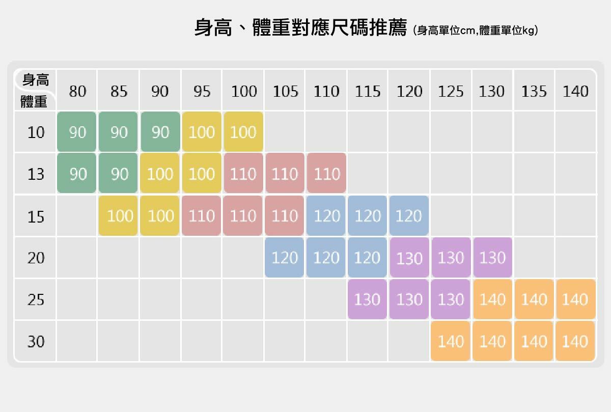 2.      由於每位孩童身材有所差異,尺寸表的年齡、身高僅供參考。