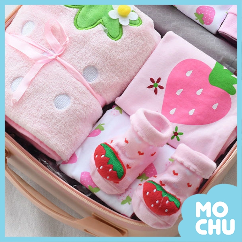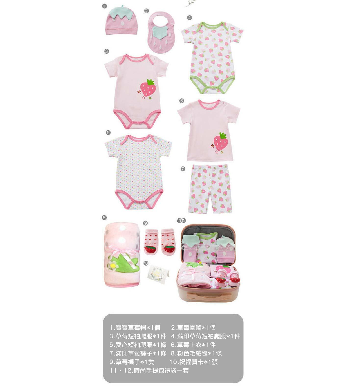 商品規格:寶寶草莓帽、草莓圍嘴、草莓短袖爬服、滿印草莓短袖爬服、愛心短袖爬服、草莓上衣、滿印草莓褲子、粉色毛絨毯、草莓襪子、祝福賀卡、時尚手提包禮袋一套