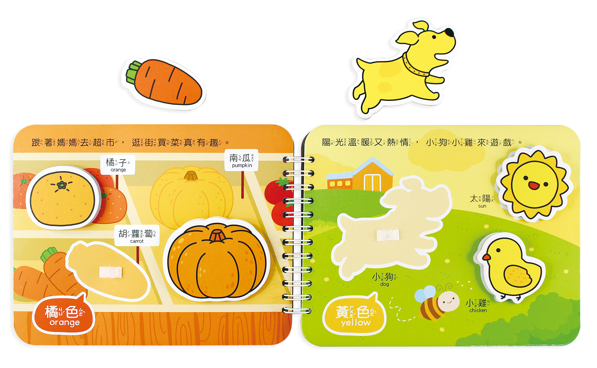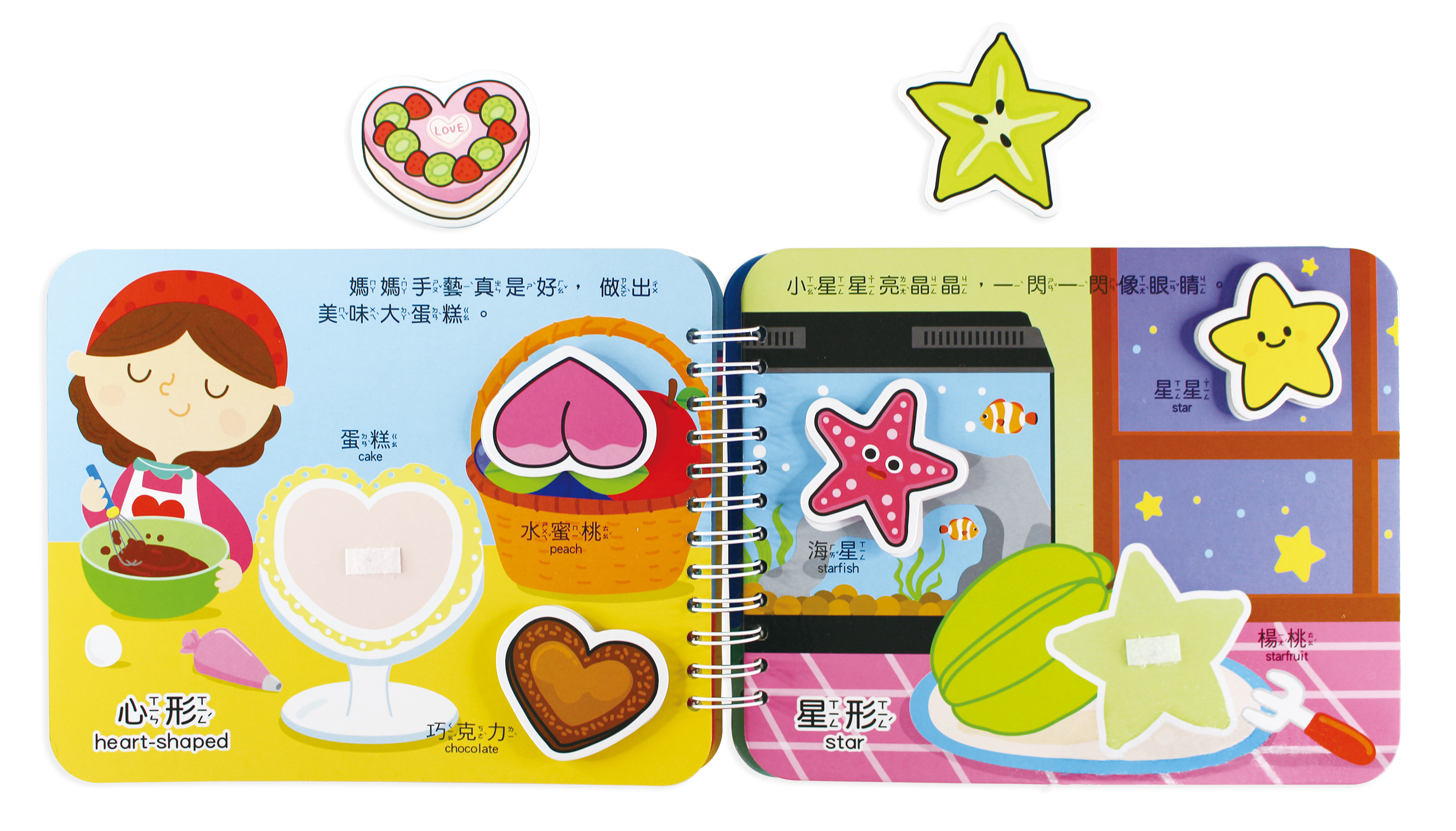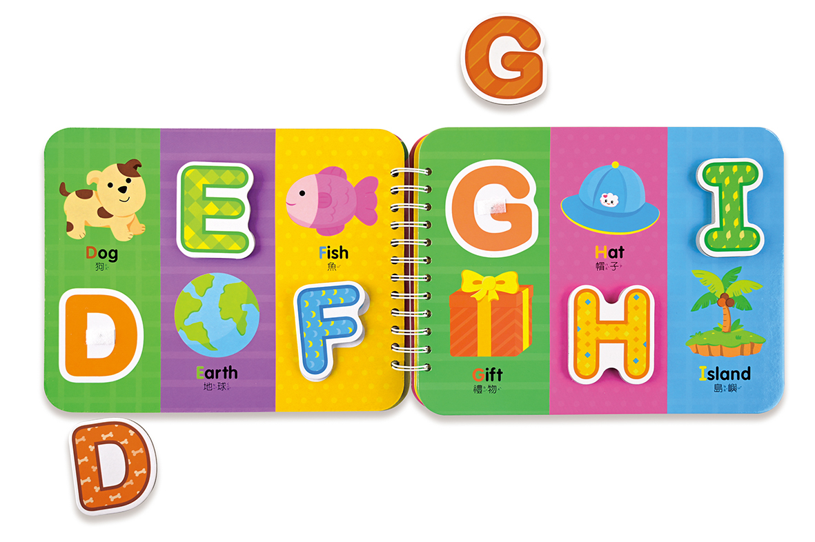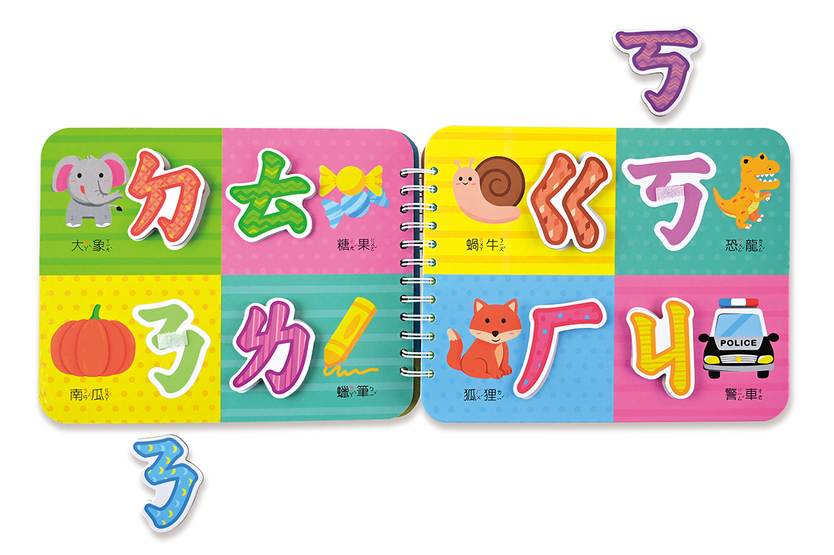 依照每個物件的輪廓,引導寶寶學習ㄅㄆㄇ及聲調、ABC字母、顏色和形狀的認知。