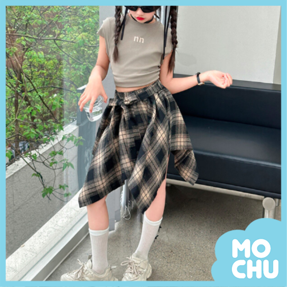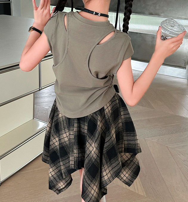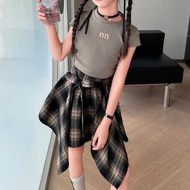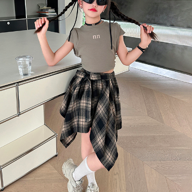 nn字母上衣+格子不規則裙套裝