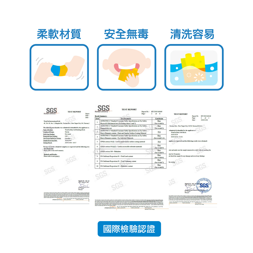 質地柔軟, 讓寶寶獨自玩樂也不必擔心受傷,材質選用通過FDA食品接觸級檢驗,讓小朋友放入口中啃咬,爸媽也不需擔心。